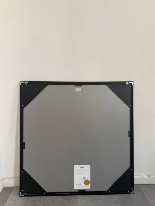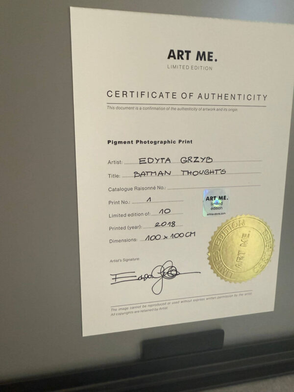 W tylnej części obrazu umieszczony certyfikat autentyczności z numerem seryjnym i sygnaturą autorki.