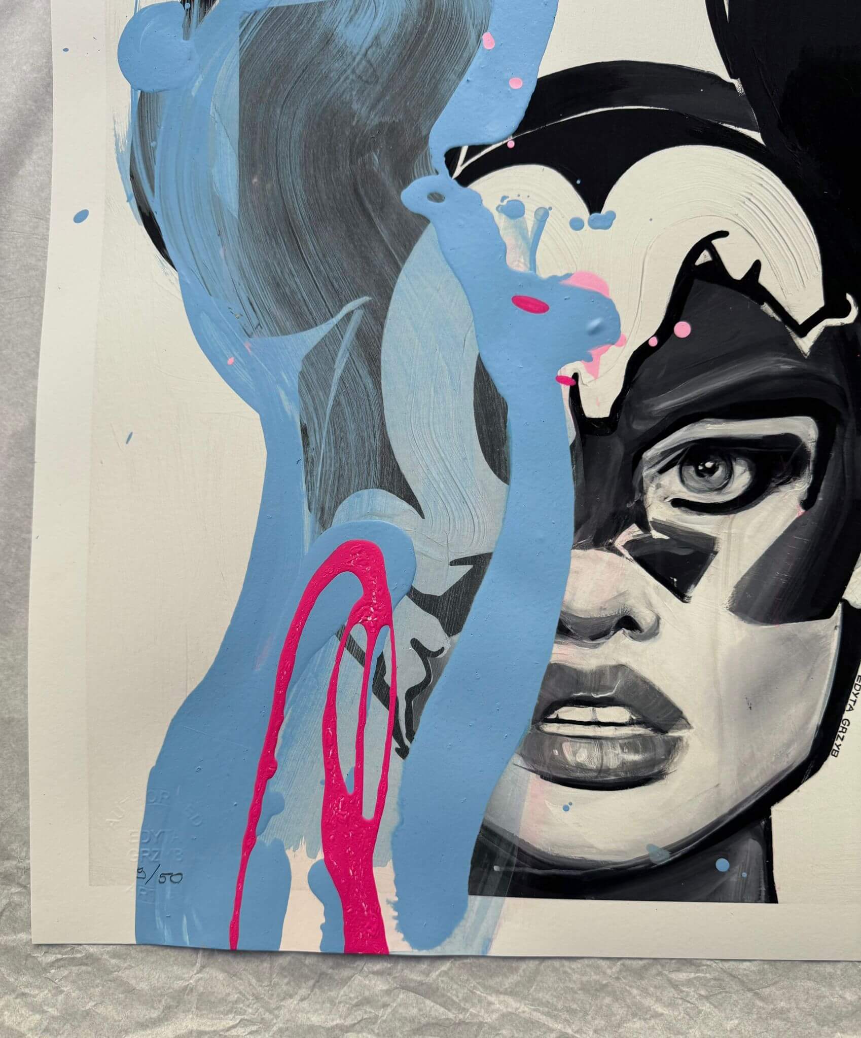 Każdy wydruk jest wykonany na wysokiej jakości papierze i częściowo malowany ręcznie farbami przez artystkę. Podstawowy wydruk pozostaje czarno-biały, natomiast akcenty kolorystyczne są dodawane manualnie, co sprawia, że każda sztuka staje się unikalna. Każdy egzemplarz jest ponadto numerowany i sygnowany na przednim marginesie.